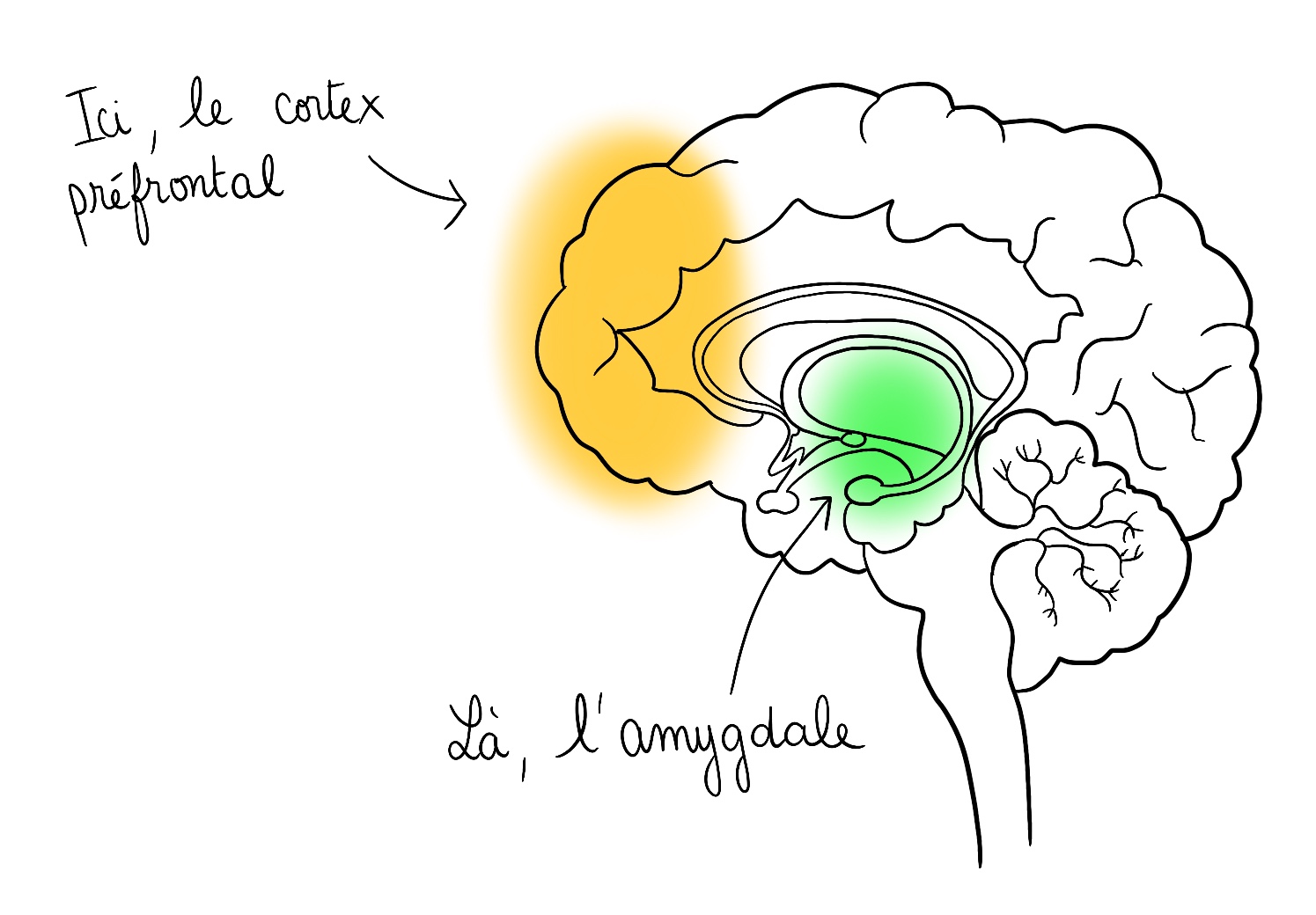 Voyons le cortex pré frontal comme le chef d’orchestre du cerveau. Son rôle est d’inhiber les impulsions, évaluer les conséquences et planifier des actions. Il permet de réfléchir avant d’agir, même lorsque l’on est très en colère.