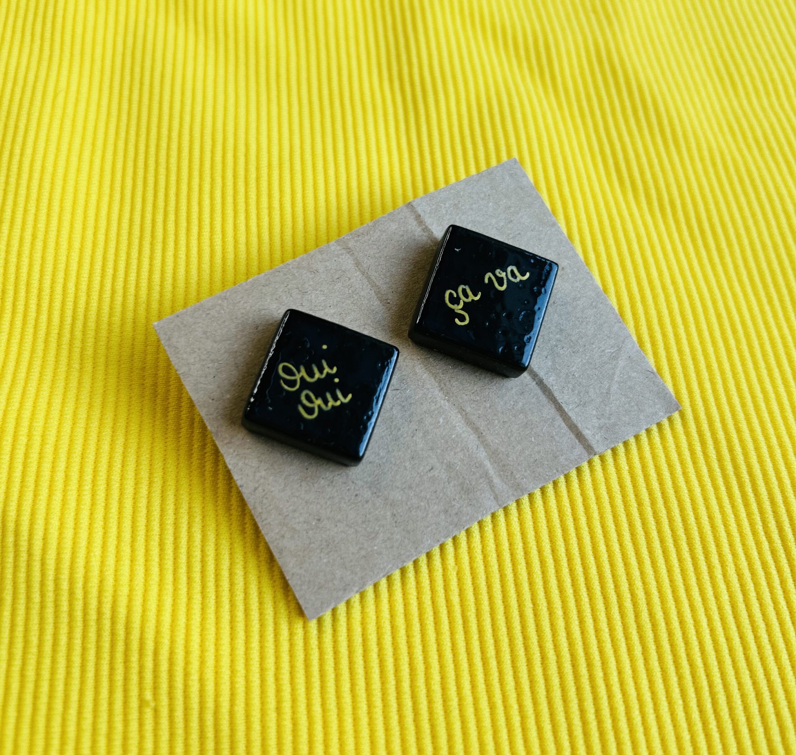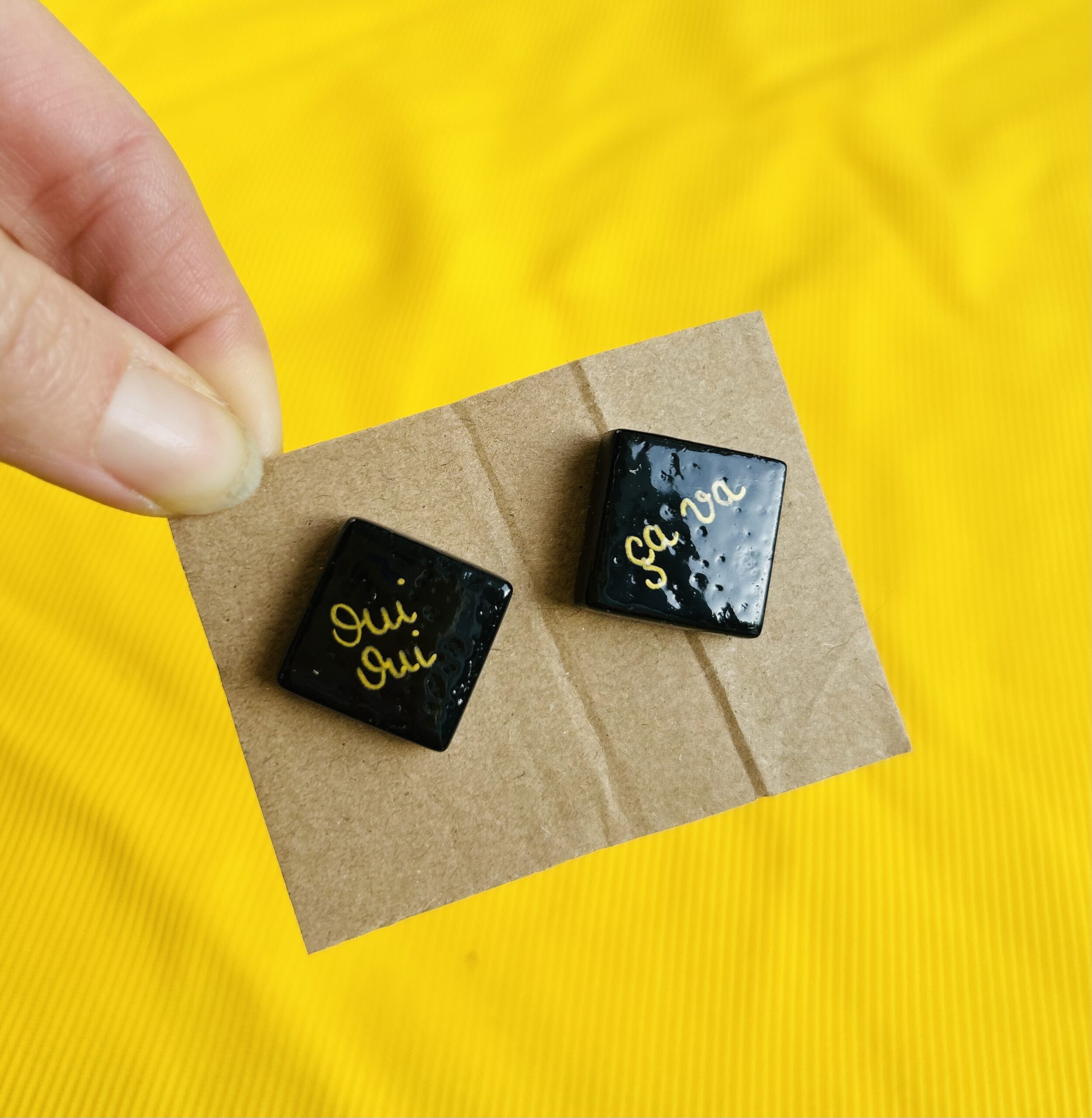 Matériaux : émaux de Briare upcyclés, supports métalliques clou, fermoir papillon, acier inoxydable hypoallergénique